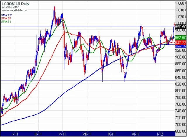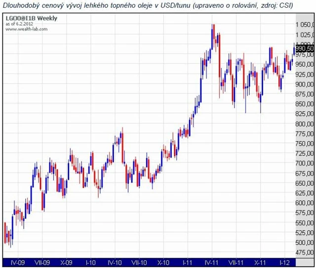 Cena lehkého topného oleje se od jara 2011 pohybovala v širokém obchodním pásmu 830 až 990 USD za tunu. Momentálně komodita proráží horní okraj pásma. Všechny tři klouzavé průměry - krátkodobý 21denní (zelená křivka), střednědobý 55denní (červená křivka) i dlouhodobý 220denní (modrá křivka) ukazují vzestupný trend. Podle technické analýzy se dá očekávat pohyb v rozsahu šířky předchozího obchodního pásma, což je přibližně 160 bodů.