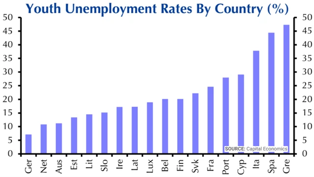 Míra nezaměstnanosti mladých (ve věku 15-24 let) se v jednotlivých zemích eurozóny výrazně liší. Velice vysoké podíly mladých lidí bez práce jsou nejen v Řecku, Španělsku či Itálii, ale také třeba ve Francii nebo Finsku. Celkově v eurozóně v září bylo celkově 8,9 % nezaměstnaných, ovšem mezi mladými to bylo 18,7 %.