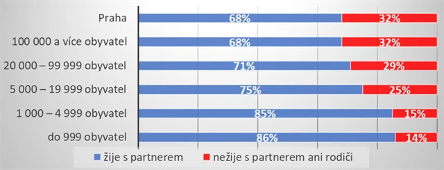 Výrazně více singles žije ve velkých městech. V sídlech nad sto tisíc obyvatel nežije ani s partnerem, ani s rodiči třetina obyvatel. Podíl lidí, kteří žijí sami, klesá s velikostí obce, v těch nejmenších žije bez partnera jen 14 % lidí.