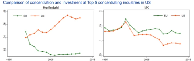 V USA je problém více strukturální. Pokles investic souvisí s hospodářskou soutěží a mírou konkurence. V posledních patnácti letech totiž došlo ke zvýšení koncentrace v sektorech (Herfindahlův index či Herfindahl-Hirschmanův index roste) a protimonopolní politika se v USA stala slabší oproti eurozóně.