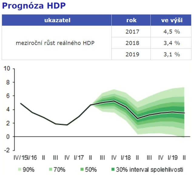 V makroekonomické prognóze zveřejněné po listopadovém zasedání ČNB zlepšila výhled vývoje tuzemské ekonomiky pro letošní i příští rok. Letos podle odhadu český HDP vzroste o 4,5 %, v srpnu banka odhadovala, že letos ekonomika přidá 3,6 %. Pro příští rok banka zlepšila odhad růstu ekonomiky na 3,4 % z 3,2 %, pro rok 2019 nechala odhad na 3,1 %.