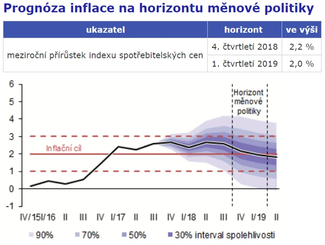 ČNB upravila také odhad vývoje inflace. Ve čtvrtém čtvrtletí příštího roku čeká míru inflace 2,2 %, zatímco v srpnu to bylo 1,8 %. Pro první čtvrtletí 2019 odhad zvýšila na 2 % z předchozích 1,8 %.
