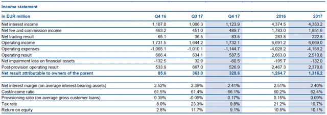 Čistý úrokový výnos Erste Group Bank loni dosáhl 4,35 miliardy eur, v roce 2016 činil 4,37 miliardy eur. Snížil se také čistý zisk z obchodních operací, a to z 283,8 milionu eur na 222,8 milionu eur. Vzrostl naopak čistý zisk z poplatků a provizí, a to z 1,78 miliardy eur na 1,85 miliardy eur. Pokles čistého úrokového příjmu Erste vysvětluje přetrvávajícím prostředím nízkých úrokových sazeb.
