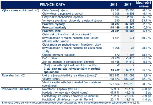 "Celkově jsou zveřejněná čísla a navrhovaná dividenda bez výraznějších překvapení, výhled je z našeho pohledu mírně pozitivní, především co se týče očekávaného poklesu provozních nákladů a přetrvávající nízké úrovně rizikových nákladů," dodal Milan Lávička.