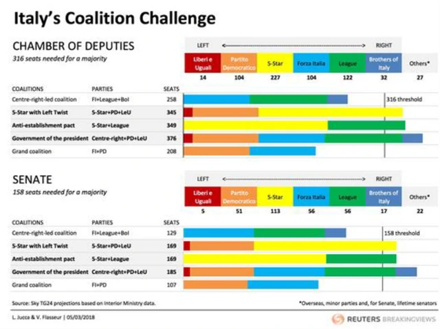 Graf zachycuje výsledné zastoupení hlavních stran v obou komorách italského parlamentu a základní varianty možných koalic v porovnání s potřebným prahem pro získání hlasovací většiny.
