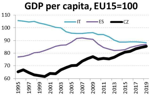 Pro srovnání jsou v grafu i Česko a Španělsko, druhé jmenované proto, aby bylo vidět, že země z jihu Evropy a eurozóny nemusejí nutně oproti průměru EU15 ztrácet.