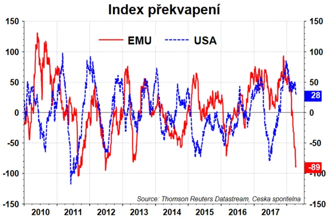 "Za povšimnutí i v této souvislosti stojí série ekonomických zklamání, která přicházejí z evropské ekonomiky. Naposledy to v týdnu byla průmyslová výroba v eurozóně, která meziročně vzrostla o 2,9 %, čekalo se ale +3,8 %," říká David Navrátil z České spořitelny.