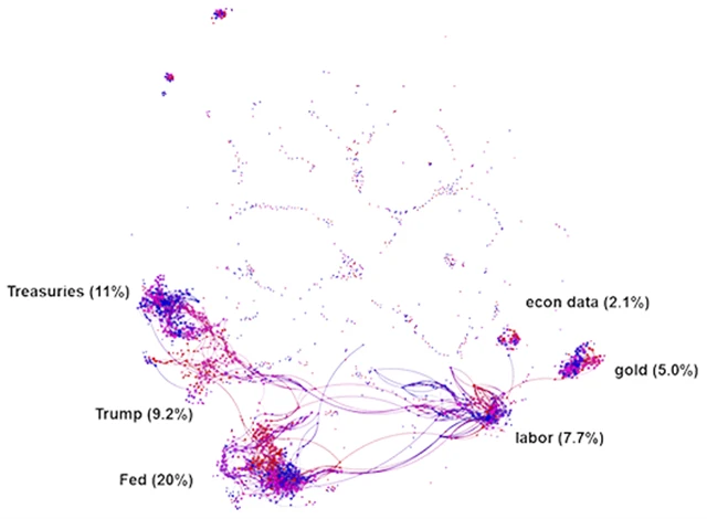 Po nástupu Donalda Trumpa do úřadu amerického prezidenta začal trh uvažovat jinak. Tematických clusterů výrazně přibylo, stejně tak se zvýšila intenzita jejich propojení. Výrazně se navíc zvýšil počet publikovaných článků, mezi dubnem 2017 a březnem 2018 jich bylo zhruba 2 400.