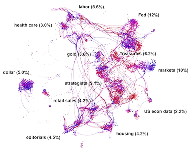 Síť je znázorněním všech textů, které Bloomberg k tématu inflace vydal mezi dubnem 2016 a březnem 2017. Celkem jich bylo zhruba 1 400. Barva bodů reprezentujících jednotlivé články přechází z modré v červenou podle data publikace. Klíčové jsou vzdálenost a propojení jednotlivých tematických clusterů.