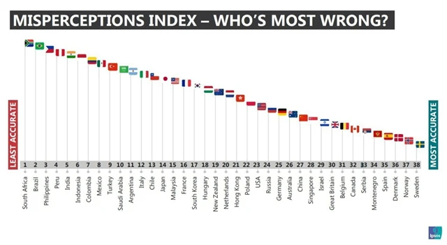 Úplně nejhůře se srovnávání věcí tehdejších a dnešních vedlo Jihoafričanům. Jižní Afrika (jaký je důvod psát "Jihoafrická republika", když také neříkáme "Finská republika" nebo "Dánské království"?) převzala pochybnou čest být nejvíce zbytečně ponurá, a to od Indie, jež tentokrát skončila na pátém místě. Brazílie, Filipíny a Peru tvoří zbytek pěti zemí, jejichž obyvatelé mají nejméně přesné ponětí o řečeném srovnání; naopak respondenti ze Švédska, Norska a Dánska byli nejpřesnější.