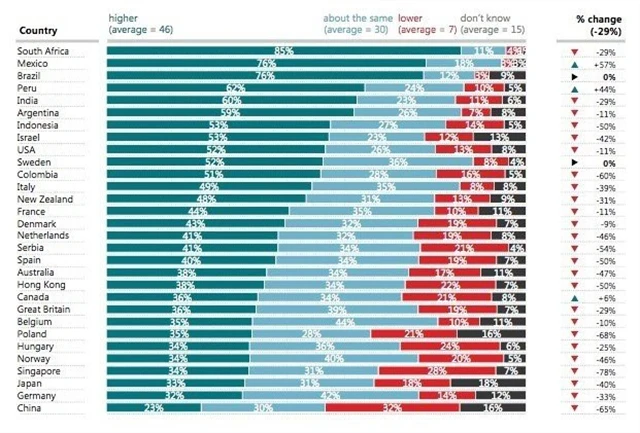 Průzkum, jejž organizovala firma Ipsos MORI na zadání Světového ekonomického fóra, zjišťoval, jak lidé smýšlejí o vývoji věcí v různých kategoriích během prvních patnácti let 21. století ve srovnání s posledními patnácti lety století dvacátého.