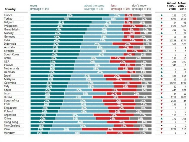 Myslíte si, že v posledních 15 letech došlo ve vaší zemi k většímu počtu úmrtí kvůli teroristickým útokům než v 15 letech před útoky z 11. září 2001 v New Yorku? Méně než pětina dotazovaných si myslí, počet takových úmrtí poklesl. Ve většině zemí uvedených v průzkumu však je ve skutečnosti výrazně nižší (celkově poklesl zhruba o polovinu).