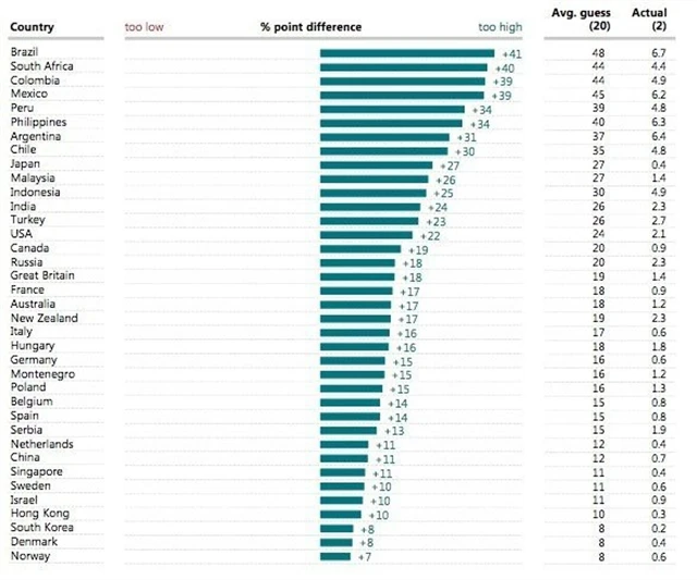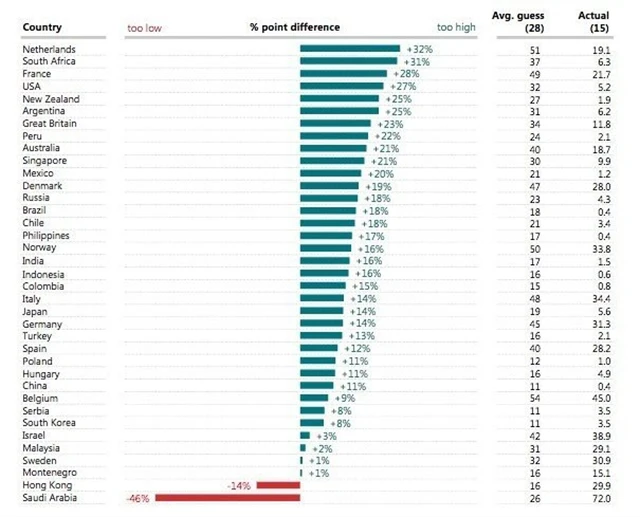 Kolik procent z celkové vězeňské populace tvoří cizinci? V odpovědi na tuto otázku lidé obvykle počty nadsazují. Američané si myslí, že zločinci pocházející ze zahraničí tvoří 32 % vězeňské populace, skutečný podíl je pouze 5,2 %. V Saúdské Arábii je naopak podíl zahraničních vězňů značně podceňován – průměrný odhad byl 26 %, skutečný údaj je 72 %.