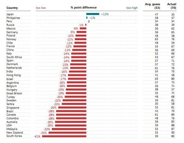 Obzvláště zábavné je srovnání odpovědí na otázky "je váš zdravotní stav dobrý?" a "kolik lidí je podle vás ve vaší zemi v dobrém zdravotním stavu"? S výjimkou Japonska, Filipín a Peru si respondenti myslí, že jsou na tom lépe než většina jejich krajanů. Nejzřetelnější je rozdíl v Jižní Koreji – Korejci se domnívají, že jen 39 % jejich krajanů bude považovat své zdraví za pevné, ale 80 % lidí považuje za pevné své vlastní zdraví.