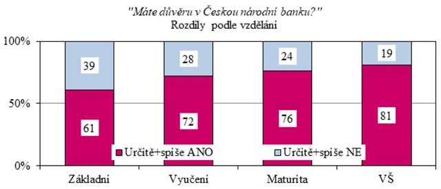 Zajímavý je i další výstup průzkumu. Důvěra v ČNB stoupá s úrovní vzdělání.