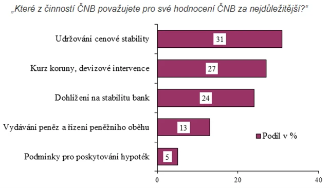 Mnohými kritizovaný kurzový závazek spadá do oblasti "kurz koruny a devizové intervence", která byla přitom hlavní pro celých 27 % hodnotitelů. Známkou vyspělosti české populace (nebo snad úspěšnosti komunikace samotné ČNB) může být, že hlavní zákonný úkol ČNB, tedy "udržování cenové stability", vnímala jako nejdůležitější kritérium největší část dotázaných (31 %).