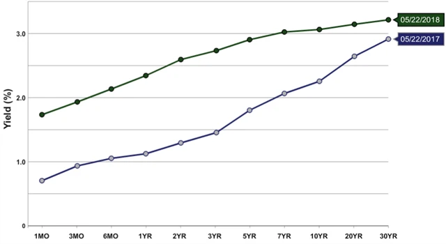 Výnosová křivka v USA se za poslední rok posunula výrazně výše, zdroj: Treasury.gov
