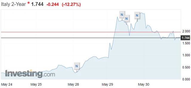V investorech na trhu s italskými vládními dluhopisy jeho středeční slova možná lehce zarezonovala. Výnosy dvouletých cenných papírů po raketovém růstu na zhruba 2,8 % ve středu rychle klesly na asi 1,75 %. Oproti stavu před týdnem jde ale stále o mimořádně rychlý nárůst.