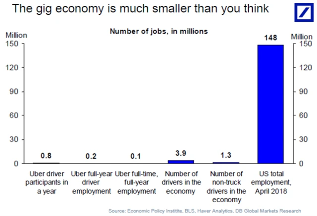 V USA je 833 tisíc řidičů Uberu, přepočteno na celoroční plné úvazky jde ale jen o 100 tisíc pozic. Ve světle celkové zaměstnanosti v Americe (bezmála 150 milionů úvazků) se možná v souvislosti s tímto odvětvím sdílené ekonomiky (a s dalšími "přivýdělky") trochu přehání.
