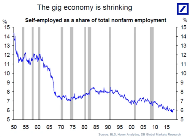 Čím si tedy gig economy zasluhuje takovou pozornost? Jestli to náhodou není tím, že spousta finančníků žijících na Manhattanu a zásobujících svět svými reporty jezdí s Uberem, a propadá i díky tomu mylnému pocitu, že jedno z nejdražších světových sídel je proxy celé ekonomiky.