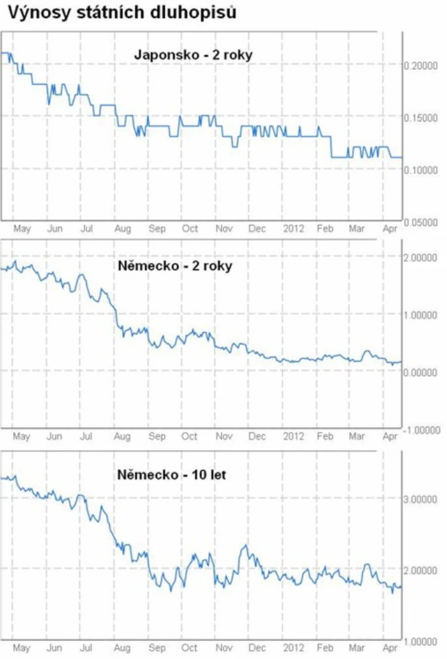 Ve středu německý dluhopisový trh investorům mrazivě připomněl japonskou zkušenost. Poprvé za posledních dvacet let se dvouletý výnos propadl pod japonské úrovně a desetiletý výnos spadl na historická minima (1,63 %). Japonci ovšem na deflační dráhu nastupovali ve chvíli, kdy měli daleko více nadhodnocené akcie, a právě jejich setrvalý propad tlačil dolů výnosy "bezpečných" fixně úročených instrumentů.