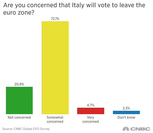 Tři čtvrtiny finančních ředitelů firem, kteří se vyjádřili ve čtvrtletním průzkumu CNBC Global CFO Council, má menší či větší obavy z případného odchodu Itálie z eurozóny.