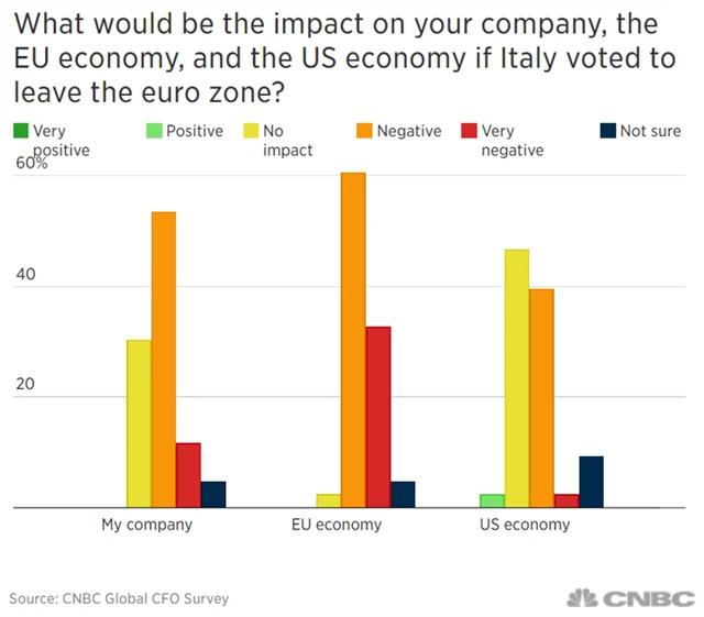 Bezmála dvě třetiny oslovených si myslí, že by případný odchod Itálie z měnové unie ovlivnil v následujících šesti měsících jejich firmy negativně. Hned 90 % je pak přesvědčeno, že by to mělo nepříznivý dopad na evropskou ekonomiku. 20 ze 43 respondentů (celkově CNBC Global CFO Council čítá 103 členů) si přitom myslí, že je evropské hospodářství nyní na cestě vzhůru a celkově si podle průzkumu ekonomika eurozóny zaslouží označení stabilní.