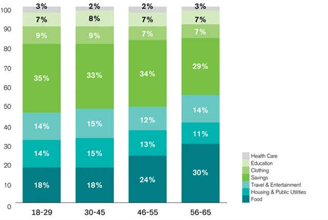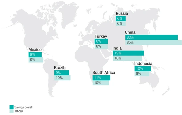 Úspory v Číně rostou extrémně rychle nejen ve světovém měřítku, ale také v porovnání s ostatními rozvíjejícími se trhy. Číňané v průměru vkládají téměř třetinu svých celkových výdajů do úspor (průměr mladých trhů je 14 %), u mladých lidí mezi 18 a 29 lety až 35 % výdajů směřuje na spoření. Není to jen tím, že by lidé v Číně byli tak uvědomělí, může jít o obavy z nedostatečné sociální péče v zemi.