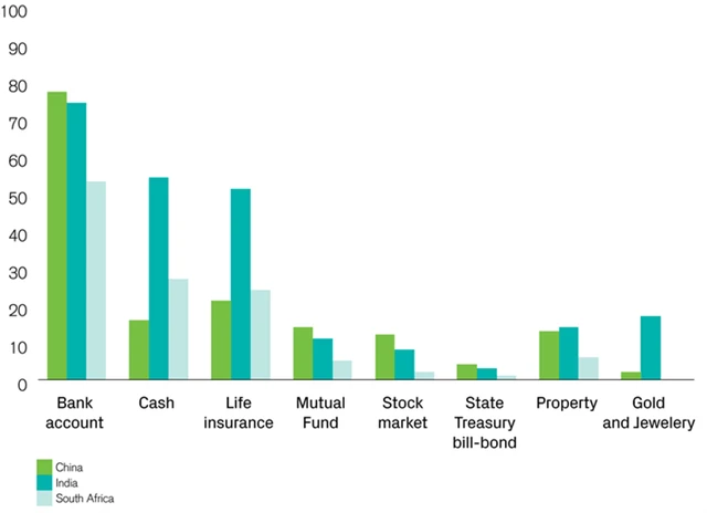 Celkově ale tyto země za rozvinutými trhy ve využívání sofistikovanějších nástrojů zaostávají. Například v Indii drží lidé ve finančních aktivech pouze 14 % svých úspor, což je v porovnání se světovým průměrem, který se drží kolem 50 %, opravdu málo. Průzkum ale ukazuje na jasný posun v chování indických střadatelů, protože podíl lidí, kteří využívají zlato jako nástroj spoření, klesl na 31 %, což je nejnižší hodnota od roku 2010. Podíl akcionářů naopak vzrostl na 19 %, což je nejvyšší hodnota od roku 2010.