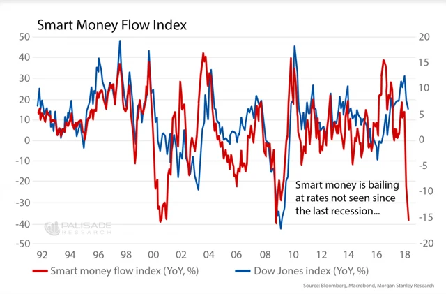 Index toků peněz investorů označovaných jako "smart money" v letošním prvním čtvrtletí zažil nejprudší propad od roku 2008 a předtím od roku 2001. Právě tento ukazatel je přitom spolehlivým předstihovým indikátorem dění na burzách.