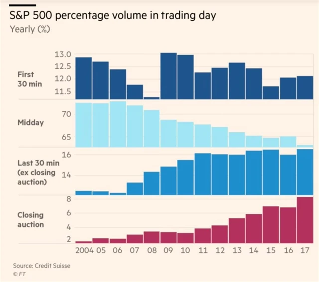 Současně hraje podle Feldera roli i růst obliby burzovně obchodovaných fondů, jejichž transakce probíhají z většiny až ke konci obchodování.