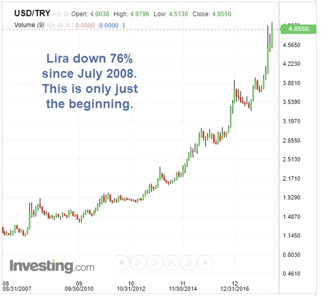 Může se to zdát jako přehnaně pesimistická předpověď, protože k hyperinflaci má Turecko stále daleko, ale pokud bude země pokračovat v nastoleném trendu, může se opakovat venezuelský scénář. Kroky prezidenta Erdoğana tomu nasvědčují. Posílá do vězení lidi s odlišnými politickými názory, převzal kontrolu nad tiskem, soudy a finančním sektorem (a může ovládnout centrální banku) a parlament z něj udělal šéfa státu s doživotním funkčním obdobím.