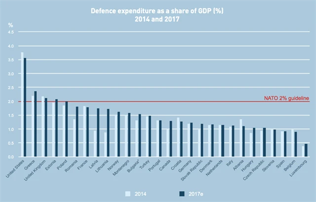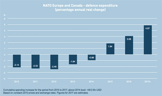3. Výdaje Kanady a evropských členů NATO od roku 2014 vzrostly o zhruba 5 %. Právě před čtyřmi lety se země (opět) zavázaly k 2% podílu armádních výdajů na HDP.