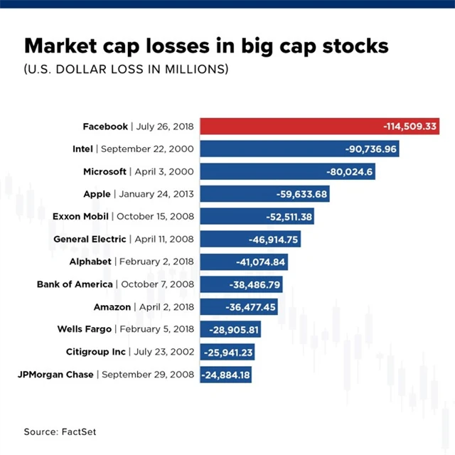 Jako první firma v historii dokázal Facebook 26. července 2018 za jediný den ztratit přes 100 miliard dolarů tržní kapitalizace. Gratulujeme, Marku!