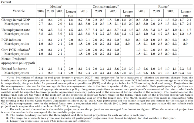 V makroekonomické prognóze zveřejněné v červnu Fed předpověděl, že hrubý domácí produkt USA se v letošním roce zvýší o 2,8 %. Mírně tak zlepšil březnovou prognózu, v níž počítal s růstem o 2,7 %. Nadále však předpokládá, že v příštím roce hospodářský růst zpomalí na 2,4 % a v roce 2020 na 2 %.