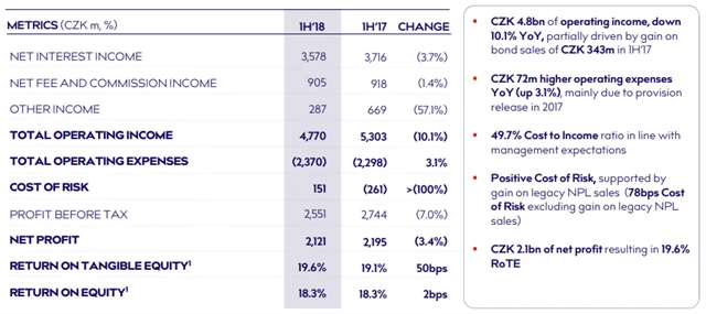 Čistý zisk na úrovni 2,12 miliardy Kč byl pozitivně ovlivněn poklesem opravných položek k poskytnutým úvěrům díky prodeji části portfolia nesplácených úvěrů. Pozitivní saldo činilo 151 milionů Kč a management díky tomuto výsledku zvýšil i odhad pro čistý zisk za celý letošní rok o dalších 200 milionů Kč na minimálně 3,7 miliardy Kč. Vedle zisku banka navýšila i odhad celkových provozních výnosů z 9,5 na 9,7 miliardy Kč či výhled ukazatele ROTE z minimálně 14 % na minimálně 16 %.