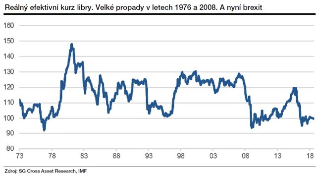 Podívejme se na historii reálného efektivního kurzu libry, který je jedním z ukazatelů konkurenceschopnosti ekonomiky. Ten se v minulosti několikrát propadl.