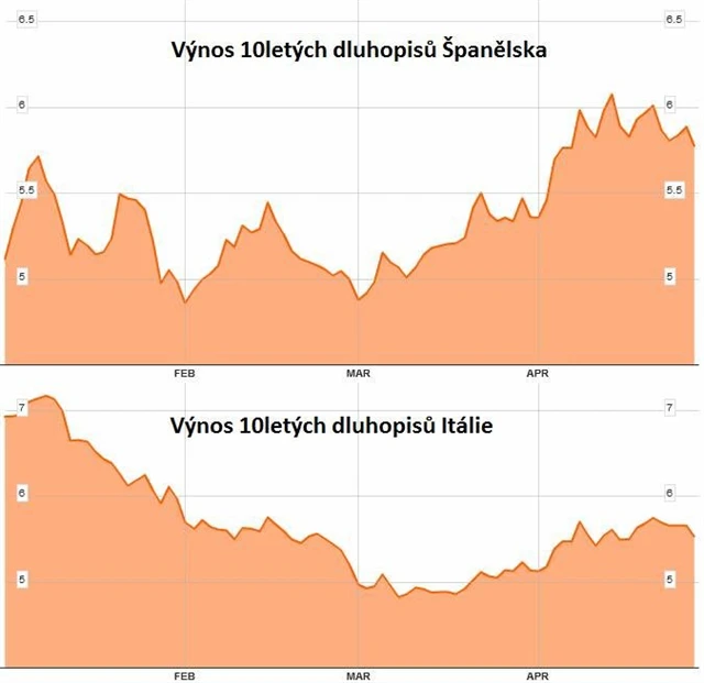 Evropští politici po dohodě o průběhu řeckého bankrotu a po nalití peněz do evropských bank (operace LTRO - půjčky od ECB) doufali, že bude chvíli klid. Ale výnosy španělských i italských dluhopisů je vyvádějí z omylu. Klid není ani okolo Francie, navíc Nizozemsko čekají předčasné volby, vláda nezískala podporu pro rozpočtové škrty.