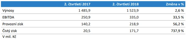 Za samotné druhé čtvrtletí společnost vykázala tržby téměř 1,5 miliardy Kč (meziročně +2,6 %), provozní zisk EBITDA 250,9 milionu Kč (meziročně +33,5 %) a čistý zisk 20,5 milionu Kč (meziročně +737,9 %).