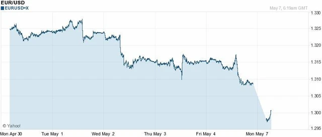 Řecké parlamentní volby dopadly fiaskem pro současnou vládní koalici, která domluvila se zahraničními institucemi úsporná opatření, která mají Řecko udržet v eurozóně. Po sečtení 99 % hlasů koalici chybějí dvě křesla k parlamentní většině. Euro proto po víkendu zavítalo pod 1,30 USD.