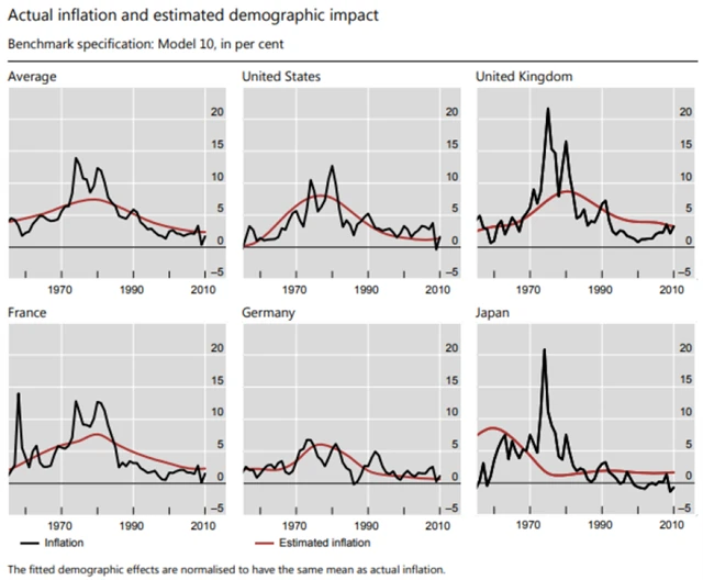 Na panelu 22 zemí v období let 1955-2010 zjistili robustní korelaci mezi demografickým vývojem a trendem ve vývoji inflace. Čím vyšší byl podíl takzvaných dětí a důchodců (tedy nepracujících) v populaci, tím vyšší inflaci země vykazovala. Lapidárně řečeno, důchodci způsobují inflaci.
