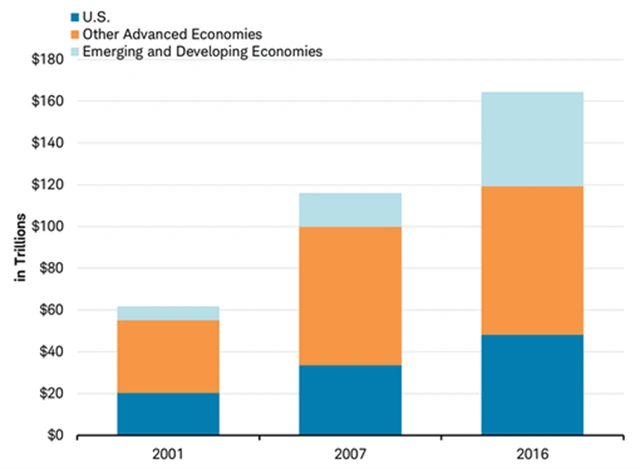 Velkým rizikem je vysoké zadlužení. Hodnota světového dluhu do konce roku 2016 narostla na 164 bilionů dolarů, což je 225 % globálního HDP. V roce 2007 přitom hodnota světového dluhu byla "jen" necelých 120 bilionů dolarů. Zadlužení Spojených států, které jsou největší světovou ekonomikou, navíc podle Mezinárodního měnového fondu dále poroste, do roku 2023 by se výše amerického dluhu v poměru k HDP měla zvýšit o dalších téměř deset procentních bodů.