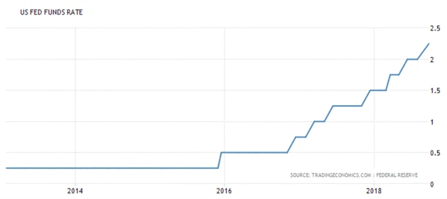 Americká centrální banka v září podle očekávání zvýšila svou základní úrokovou sazbu o čtvrt procentního bodu do rozpětí 2,00-2,25 %. V prohlášení uvedla, že do konce letošního roku plánuje zvýšit úroky ještě jednou a příští rok přikročí ke třem zvýšením sazeb.