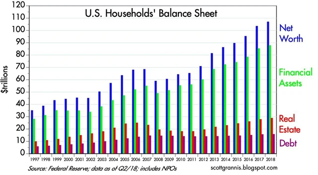 Podle zprávy americké centrální banky z konce září, která se věnuje odhadům čistého bohatství Američanů, klesly jejich dluhy na 33leté minimum a čisté bohatství dosáhlo nového maxima v nominálním i reálném vyjádření (a také na jednoho obyvatele). Scott Grannis, někdejší ekonom ve Western Asset Management, na svém blogu zveřejnil několik grafů, které zobrazují růst bohatství Američanů v posledních letech.