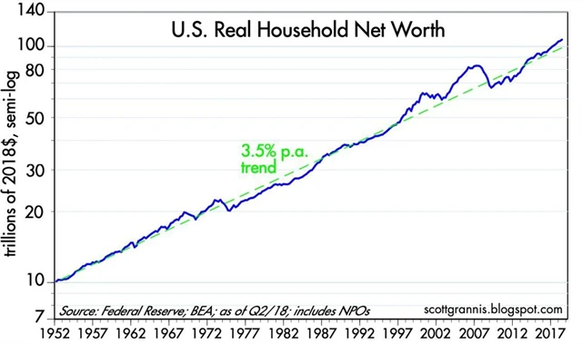 Třetí graf ukazuje dlouhodobý trend nárůstu čistého bohatství domácností v USA. Za posledních 66 let roste čisté bohatství ročně o 3,5 % a i přes dvě finanční krize v tomto tisíciletí se od trendu příliš neodchýlilo.