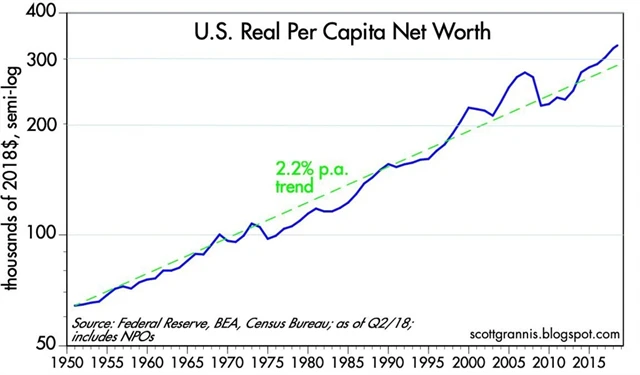 Na čtvrtém grafu je zobrazeno čisté bohatství na jednoho obyvatele USA. Průměrný Američan vlastní majetek v hodnotě asi 327 000 dolarů, přičemž za posledních 67 let roste toto bohatství o 2,2 % ročně. Rozdíl v tempu růstu mezi posledními dvěma údaji je způsoben nárůstem populace.