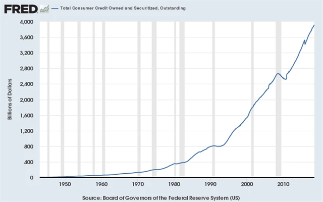 Aby ale klidu a radosti nebylo příliš, klesající zadluženost možná nebude až tak pozitivní, když se podíváme na spotřebitelské půjčky v USA, které se docela rychlým tempem blíží ke čtyřem bilionům dolarů.