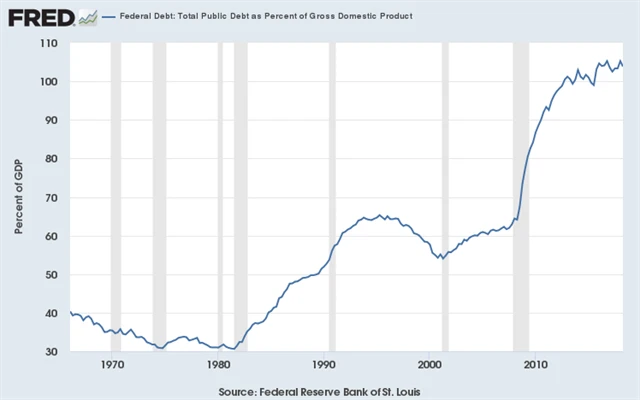 V poměru k HDP vzrostlo zadlužení USA za posledních 33 let ze 43 % na více než 105 %.