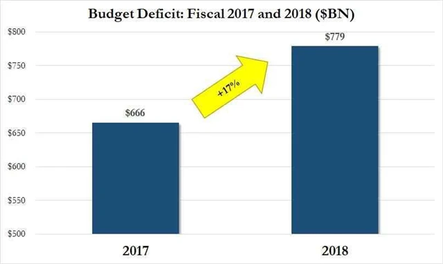 Rozpočtový schodek Spojených států ve fiskálním roce 2018 vzrostl o 113 miliard dolarů na 779 miliard dolarů. Dosáhl tak nejvyšší úrovně od fiskálního roku 2012. Vyplývá to z údajů amerického ministerstva financí. Fiskální rok v USA končí 30. září.