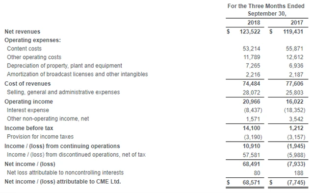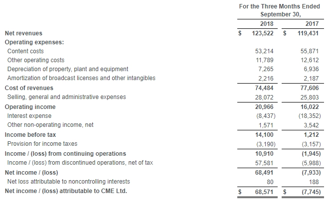 Za prvních devět měsíců roku vykázala společnost tržby 422,26 milionu USD a čistý zisk 101,86 milionu USD. O rok dříve měla ve stejném období tržby 174,21 milionu USD a zisk 9,13 milionu USD. Příjmy z televizní reklamy v prvních devíti měsících roku stouply o 12 % (bez vlivu FX o 3 %) a příjmy z předplatného a přenosových poplatků o 12 % (bez vlivu FX o 5 %).